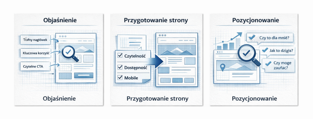 Wdrożenie nie polega na „zrobieniu strony”. Polega na przełożeniu przewagi konkurencyjnej na doświadczenie użytkownika i na język decyzji. Efekt końcowy musi być mierzalny: zwiększona konwersja ruchu w zapytania, telefony, formularze, rezerwacje, zgłoszenia lub zapytania ofertowe.